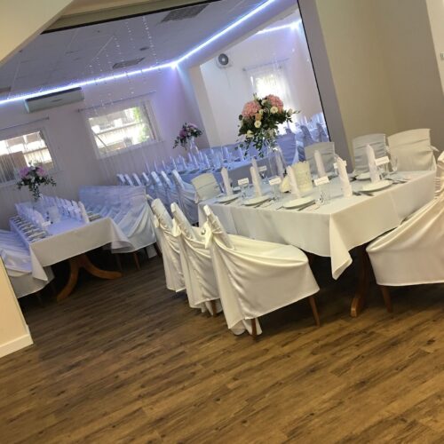 Nasza sala weselna jest w pełni klimatyzowana oraz zapewnia zorganizowanie niezapomnianej imprezy nawet dla 120 osób. Istnieje możliwość podziału sali na dwie części: większej dla 60 osób oraz mniejszej dla 30. Na całej jej długości znajdują się przestronne okna, które wieczorową porą, ozdobione świecami tworzą niesamowity klimat. Z Sali, aby zaczerpnąć świeżego powietrza, Goście mogą wyjść na werandę lub odpocząć w zadaszonym kąciku grillowym. Sala jest świeżo po remoncie. Zainstalowane jest także oświetlenie LED, z możliwością zmiany koloru. Tworzy to wyjątkowy i niepowtarzalny klimat. Oferujemy również możliwość zorganizowania imprez przy okrągłych stołach.